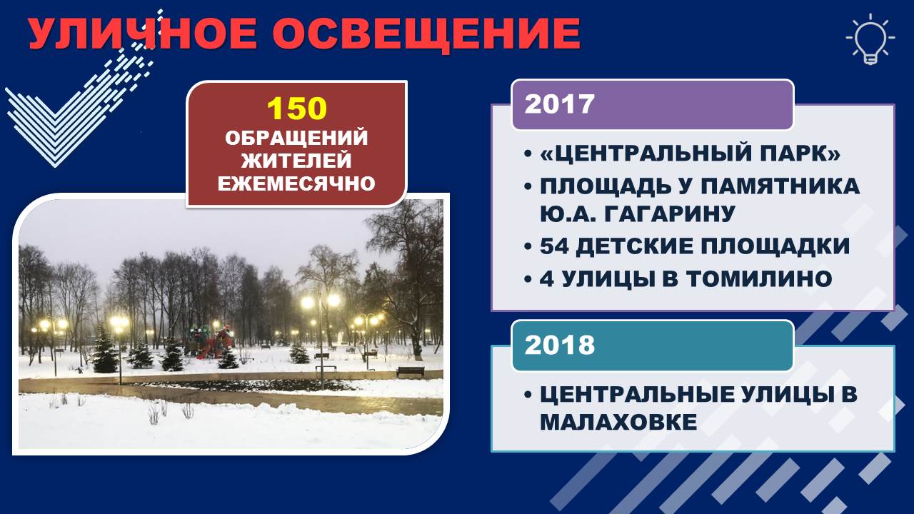 Много жалоб и обращений мы получаем на портал «Добродел» по вопросам уличного освещения. В среднем до 150 шт. в месяц. Проблема есть и для ее решения должен быть выработан системный подход. С этой целью в этом году ставлю задачу разработать паспорт сетей наружного освещения округа и на его основе заключить энергосервисный контракт на их обслуживание.