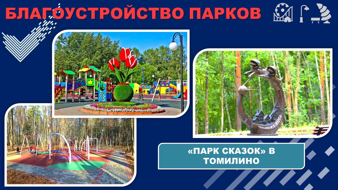 Серьезные изменения произошли в комплексном благоустройстве лесопарковой территории в Томилино: теперь там оборудован «Парк Сказок» с тематическими площадками, установлены композиции и скульптуры по мотивам сказок, спортивные площадки, скамейки и урны, проложены пешеходные дорожки.