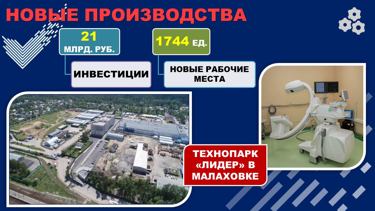 Реализован проект по строительству в Малаховке технопарка «Лидер». Первым резидентом технопарка стала компания Дженерал Электрик, которая перенесла свое производство из Москвы к нам. В церемонии открытия технопарка принял участие Губернатор Московской области А.Ю. Воробьёв. Завод выпускает реанимационные системы для вынашивания недоношенных детей, компьютерные томографы, ультразвуки.