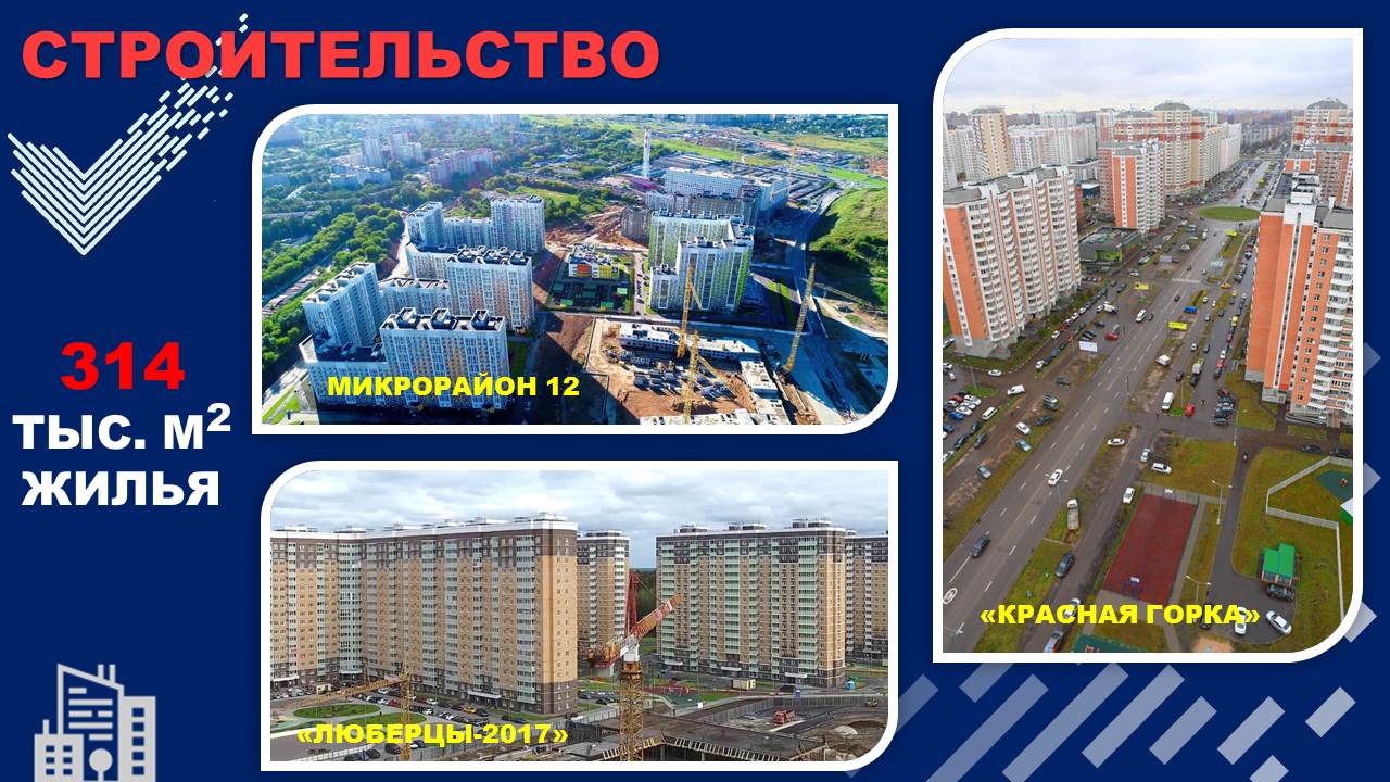 Активно ведется на нашей территории жилищное строительство. Ввели в эксплуатацию в прошлом году 314 тыс. кв.м жилья, в основном за счет жилого комплекса «Люберцы-2017», микрорайона «Красная горка» и микрорайона 12. Снесли 9 ветхих жилых домов, из которых расселили в новое жилье 416 человек. Начали развитие застроенной территории микрорайона Птицефабрика в Томилино, где будут расселены 20 ветхих домов. Сняли проблему достройки группы жилых домов ЖК «Грин Сити» в Красково и в настоящее время ведется подготовка документов для ввода их в эксплуатацию. Это - 484 дольщика. Для решения этой проблемы были привлечены надежные застройщики: компании - «ПИК» и «Промстрой». Достигнуто соглашение с компанией «Ареал» о достройке проблемных домов в Малаховке, брошенных застройщиком «АНТ».