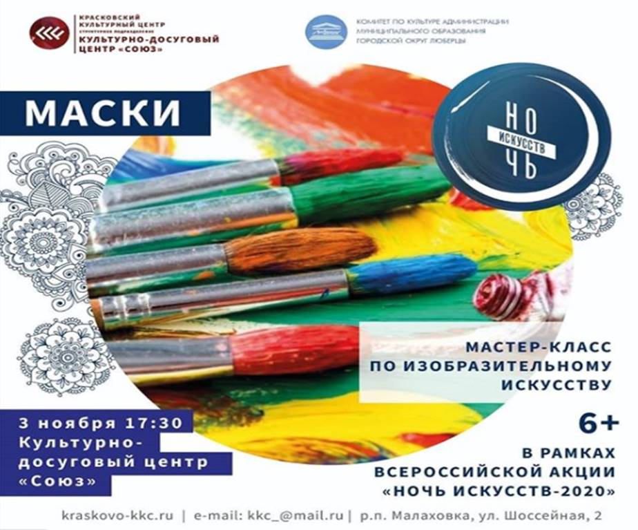 Во вторник, 3 ноября, КДЦ «Союз» приглашает люберчан на онлайн-мероприятия в рамках Всероссийской акции «Ночь искусств-2020»: