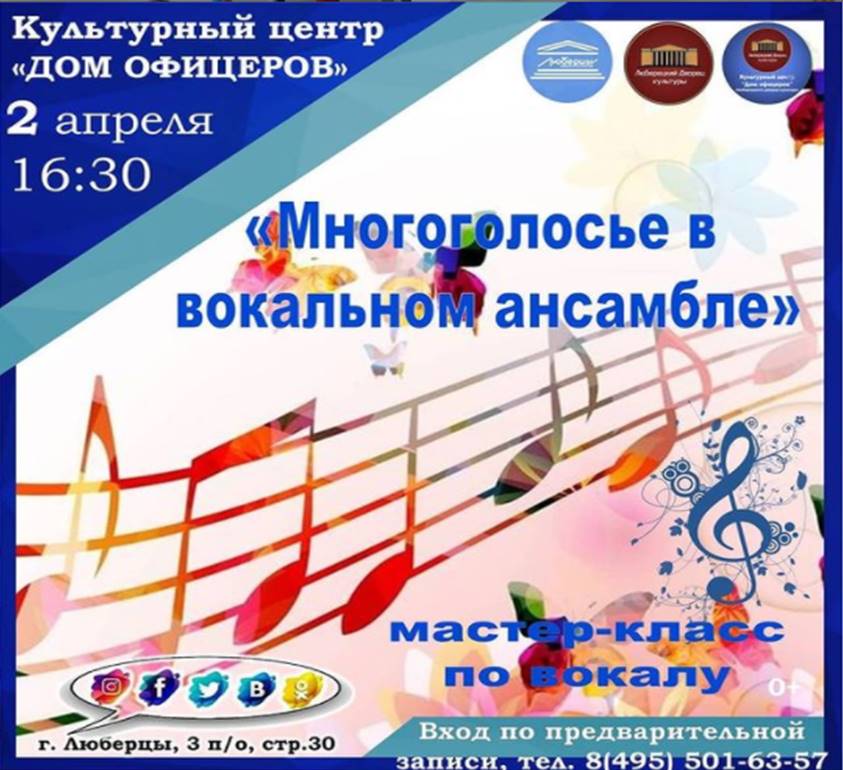 В пятницу, 2 апреля, культурный центр «Дом офицеров» приглашает люберчан на мастер-класс по вокалу «Многоголосье в вокальном ансамбле».