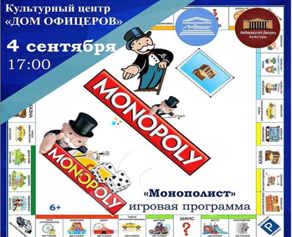 В пятницу, 4 сентября, культурный центр «Дом офицеров» приглашает юных люберчан на игровую программу «Монополист». Начало в 17:00.