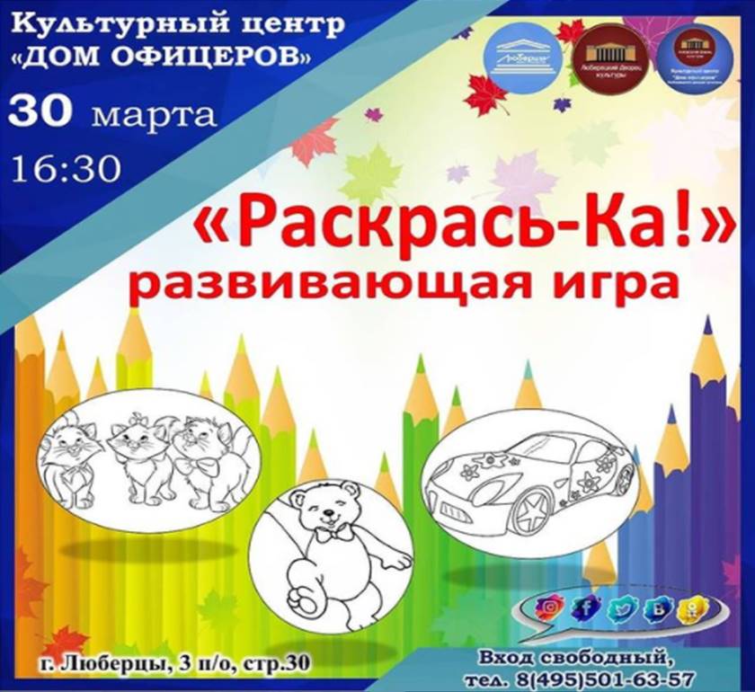 Во вторник,30 марта, культурный центр «Дом офицеров» приглашает юных люберчан присоединиться к развивающей игре «Раскрась-Ка».