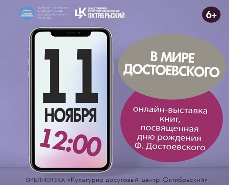 12:00 «В мире Достоевского» - выставка книг, посвященная дню рождения Федора Достоевского.
