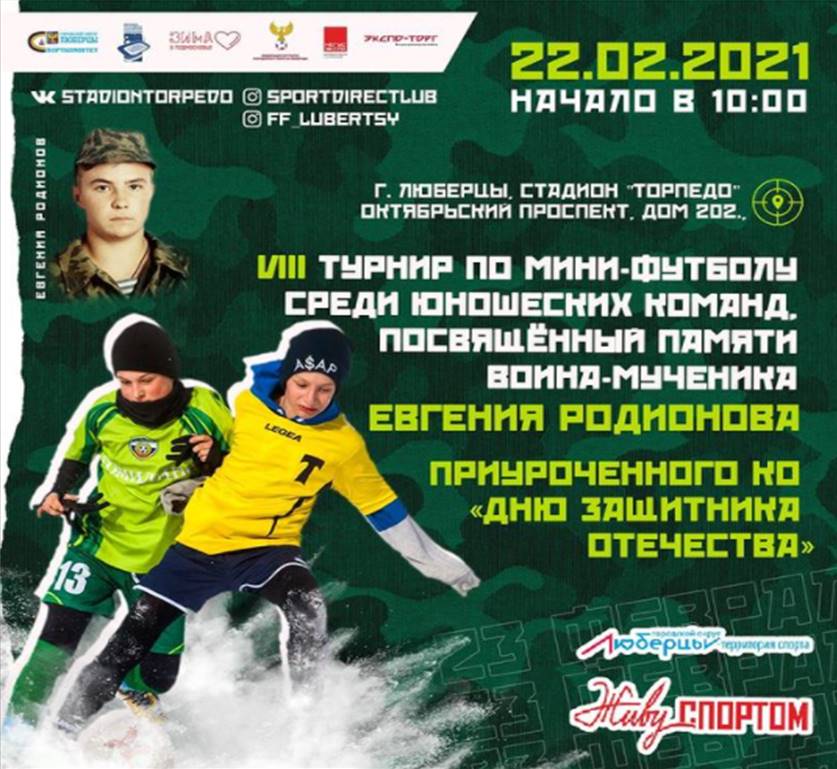 «Двадцать второго февраля на стадионе «Торпедо» в Люберцах состоится турнир по мини-футболу среди юношеских команд памяти воина-мученика Евгения Родионова. Начало в 10:00», – говорится в сообщении.