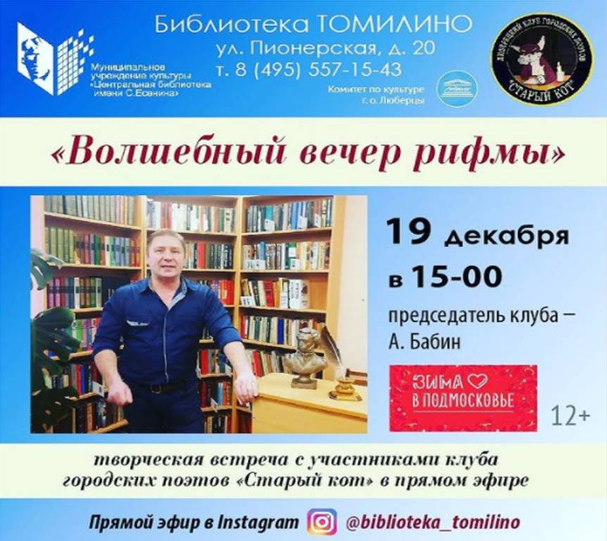 В эту субботу, 19 декабря, в Инстаграм-аккаунте библиотеки «Томилино» городского округа Люберцы состоится вечер поэзии «Волшебный вечер рифмы». Прямой эфир начнется в 15:00.