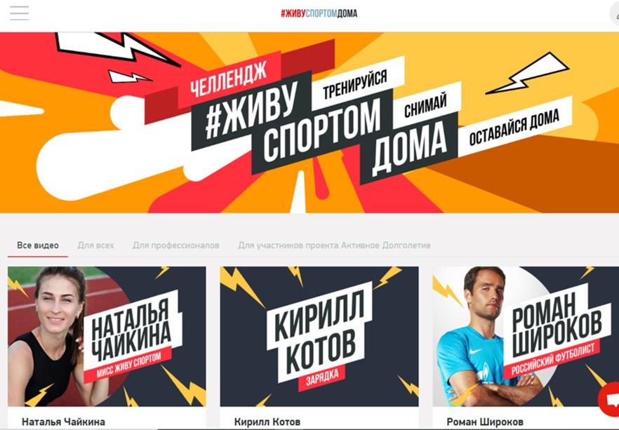 28 марта 2020 года на ресурсах спортивного портала «Живу Спортом» началась серия тренировок в прямом эфире. Знаменитые российские спортсмены рассказывают, как поддержать физическую форму в домашних условиях.