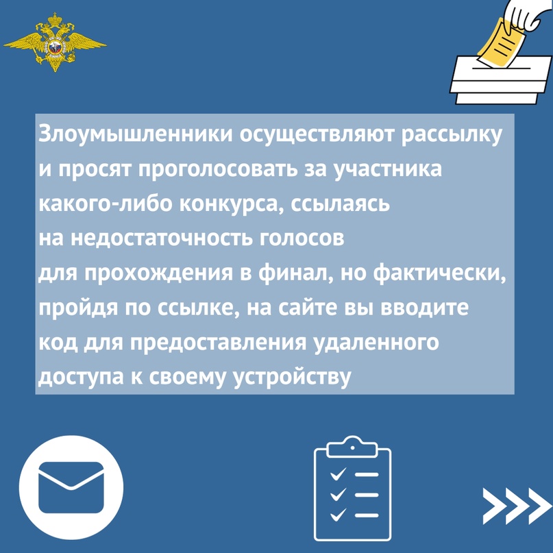 Злоумышленники осуществляют рассылку и просят проголосовать за участника какого-либо конкурса, ссылаясь на недостаточность голосов для прохождения в финал. В сообщении прикреплена ссылка, по которой необходимо пройти для голосования, но фактически, пройдя по ней, вы вводите код для предоставления удаленного доступа, подключения другого устройства к своему мессенджеру.