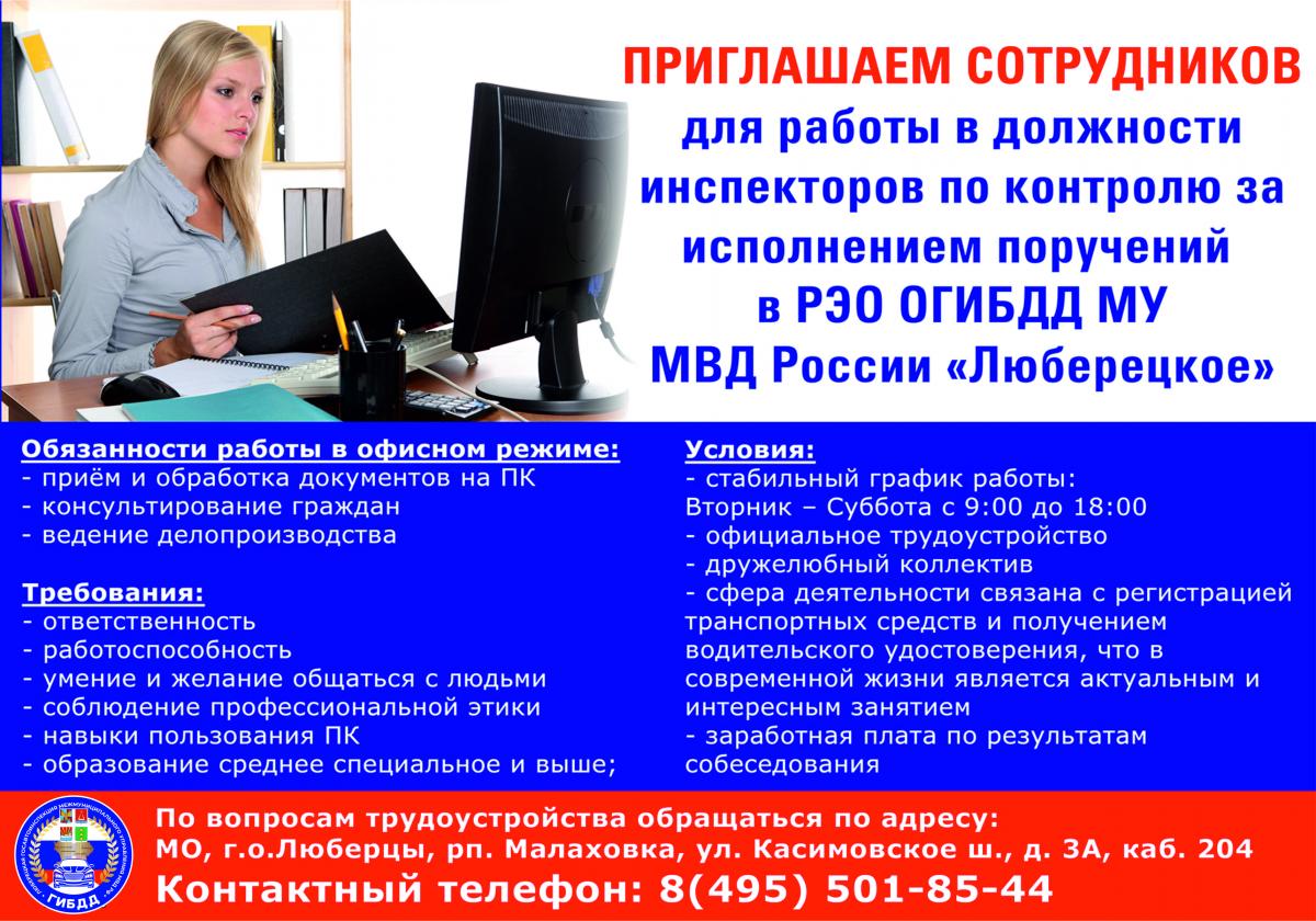 Госавтоинспекция МУ МВД России «Люберецкое» приглашает сотрудников для работы в должности инспекторов по контролю за исполнением поручений в РЭО ОГИБДД МУ МВД России «Люберецкое».