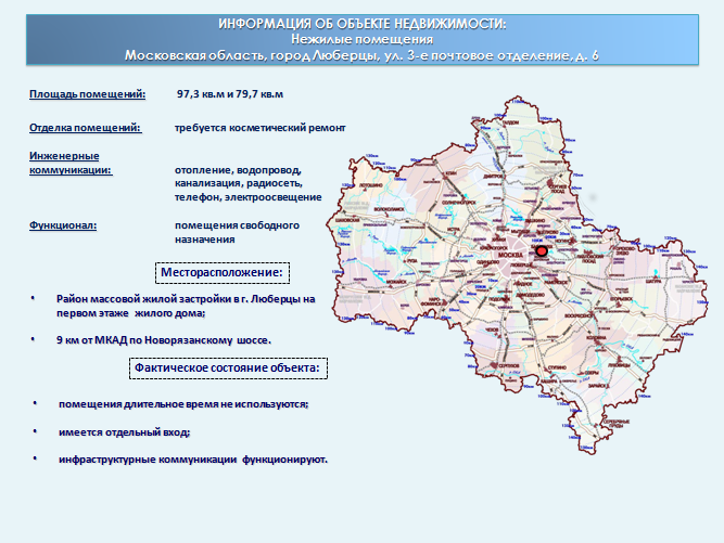 Нежилые помещения, назначение: нежилое, общая площадь 97,3 кв. м, этаж 1 и подвал, номера на поэтажном плане IX, адрес (местонахождение) объекта: Московская область, г. Люберцы, п/о 3, д. 6, кадастровый (или условный) номер 50-50-22/093/2009-122, находящиеся в собственности Московской области, о чем в Едином государственном реестре прав на недвижимое имущество и сделок с ним 07.06.2013 года сделана запись регистрации № 50-50-61/006/2013-264;