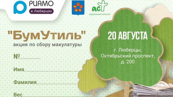 В субботу, 20 августа, в Люберцах пройдет акция по сбору макулатуры «БумУтиль». Как рассказал глава Люберецкого района Владимир Ружицкий, ее организаторами выступили Региональное информационное агентство Московской области (РИАМО), издательская группа «АСТ», а также администрация Люберецкого района и города Люберцы.