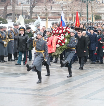 Церемония возложения венка к Могиле Неизвестного Солдата сопровождалась музыкой в исполнении военного оркестра и маршем солдат различных родов войск. Павших героев почтили минутой молчания.