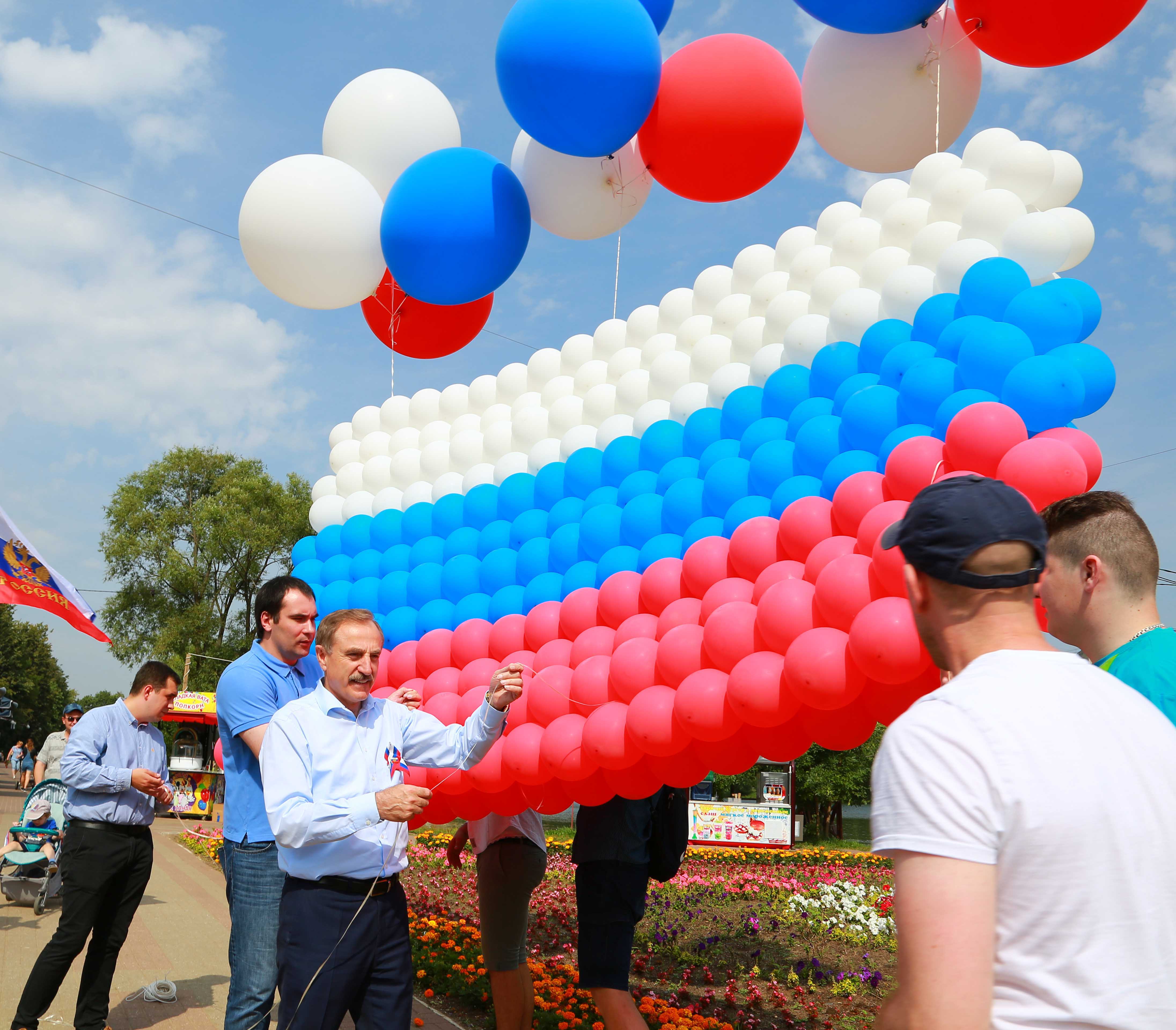 Глава принял участие в торжественной церемонии поднятия в небо флага России из воздушных шаров. В парке в этот день прошел концерт.Всем участникам праздника раздали ленточки в цветах российского триколора.