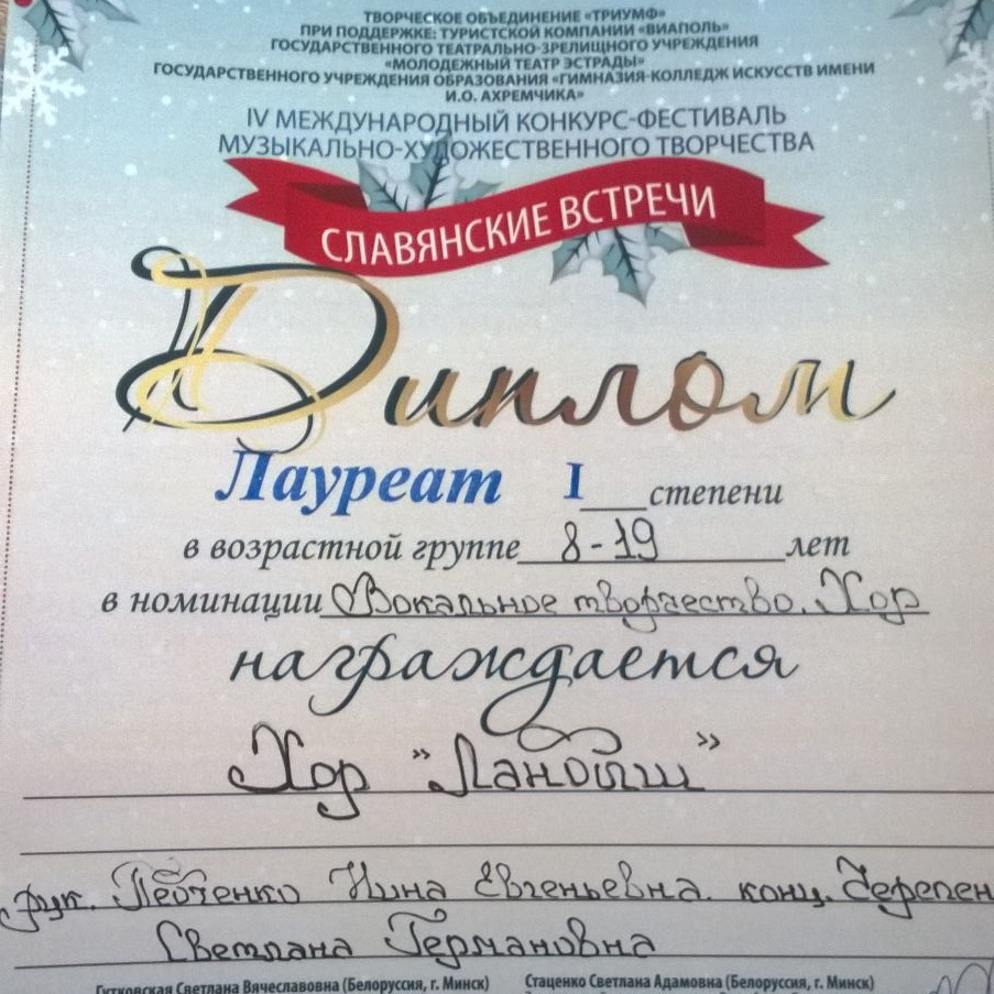 На IV Международном конкурсе-фестивале музыкально-художественного творчества «Славянские встречи», прошедшем в Минске, хор «Ландыш» ДШИ им. Л. И. Ковлера г. п. Малаховка Люберецкого района стал лауреатом I степени.