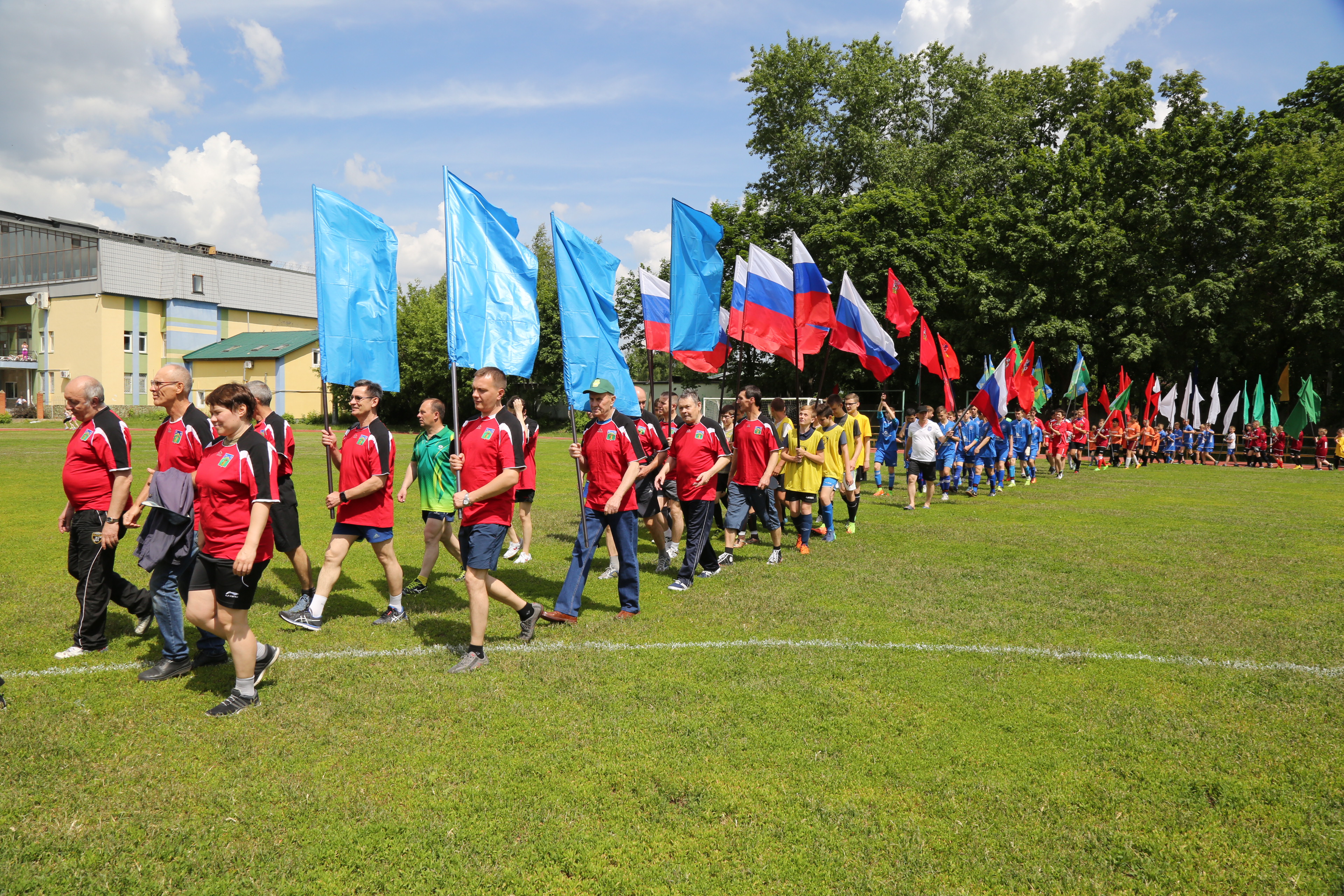 На стадионе «Урожай» в поселке Томилино городского округа Люберцы проходит большой спортивный праздник «Вперед, Россия!». Около трехсот участников вышли на торжественное построение, с которого началась череда праздничных спортивных состязаний. Традиционно это мини-футбол, настольный теннис, уличная гимнастика, тяжелая и легкая атлетики. Родители и дети, занявшие места на трибунах болельщиков, готовятся к семейным состязаниям «Веселые старты».