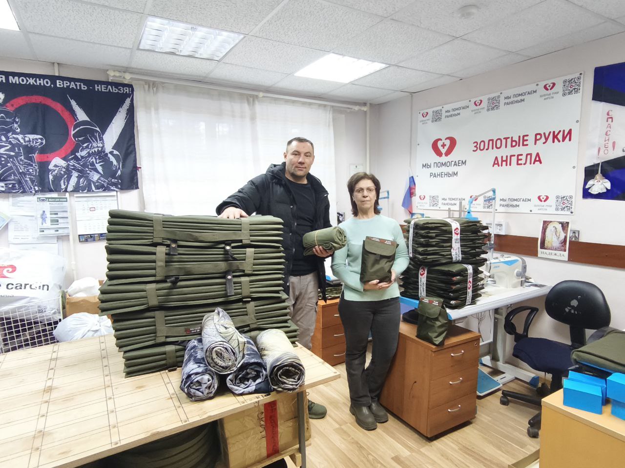 В переданную партию вошли средства обустройства быта — туристические коврики (карематы) и блиндажные подушки, специальные средства защиты — антидроновые плащи, а также одежда и экипировка: непромокаемые дождевики, белые халаты и другие востребованные вещи.