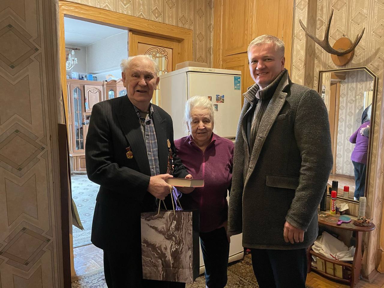 «Наш долг - поздравить тех, кому мы обязаны мирным небом - ветеранов Великой Отечественной войны. Поздравил нашего дорогого участника Великой Отечественной войны из Люберец Игоря Павловича Авдеева с праздником. Он ушел на фронт в ноябре 1943-го. Освоил специальность снайпера. Но, получив тяжёлое ранение, вернулся домой. Поступил в Люберецкий техникум сельскохозяйственного машиностроения, после войны устроился на ГЛЗ, где проработал более 35 лет. Имеет множество наград и медалей», - сказал Дениско.
