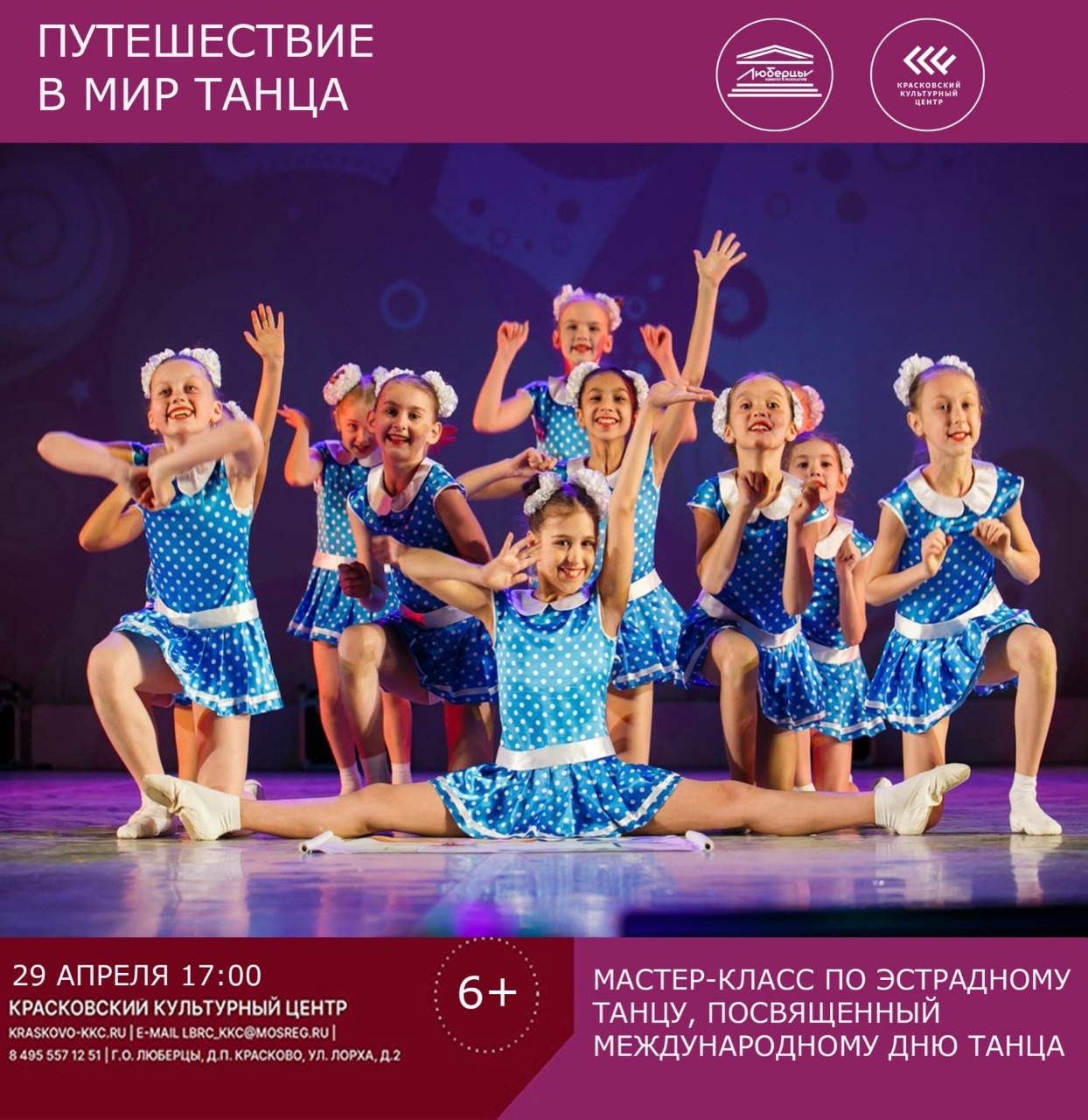 «В пятницу, 29 апреля, в Красковском культурном центре состоится танцевальный мастер-класс, посвященный Международному дню танца. Руководитель ансамбля Людмила Бусыгина. Участники Образцового коллектива хореографического ансамбля «Волшебная страна» познакомят присутствующих с базовыми движениями эстрадного танца, продемонстрируют несколько комбинаций и танцевальных связок. Начало концерта в 17.00», - говорится в сообщении.