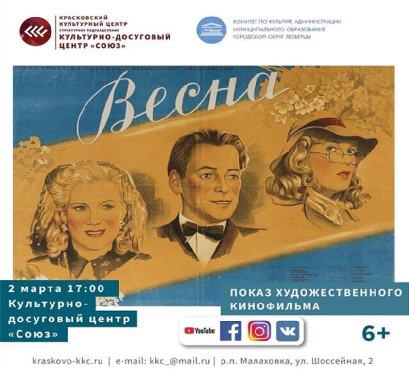 Во вторник, 2 марта, КДЦ «Союз» приглашает люберчан на показ художественного фильма «Весна».