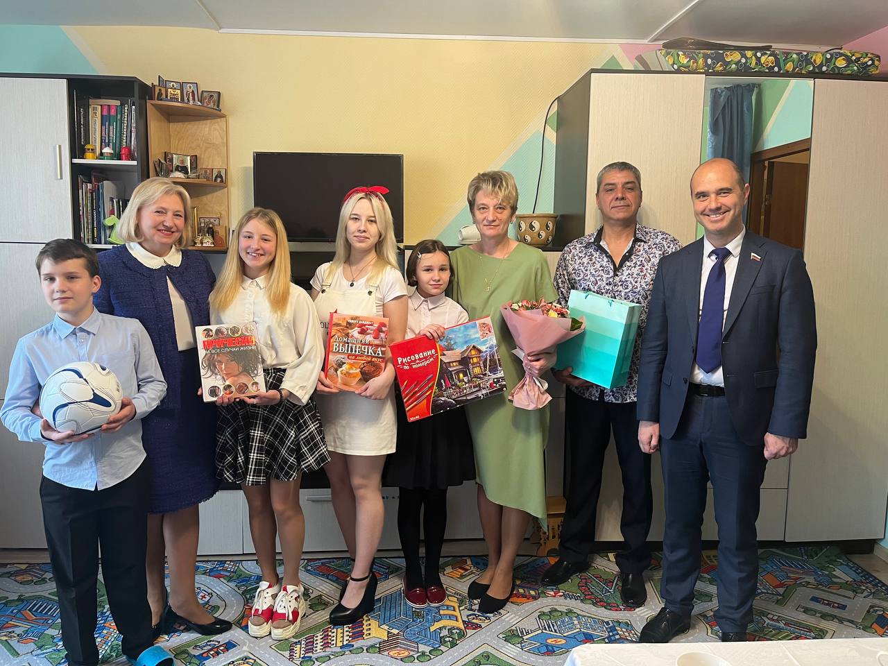 Маме Анастасии партийцы со словами благодарности и поздравлений вручили цветы. Детям – подарки по интересам: обучающие книги, спортивный инвентарь, игрушки.