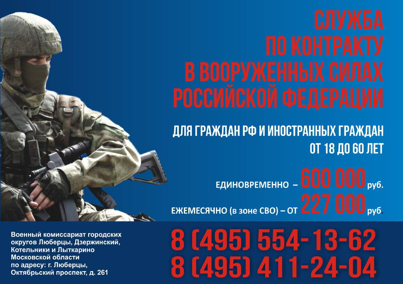 «Единовременно для военнослужащих выплачивается 600 тысяч рублей, ежемесячно в зоне СВО – от 227 тысяч рублей. Контрактнику гарантированы и социальные льготы. Подробную информацию можно узнать на сайте контрактмо.рф или по телефонам военного комиссариата в Люберцах: 8 (495) 554-13-62, 8 (495) 411-24-04», - добавил Антоненков.