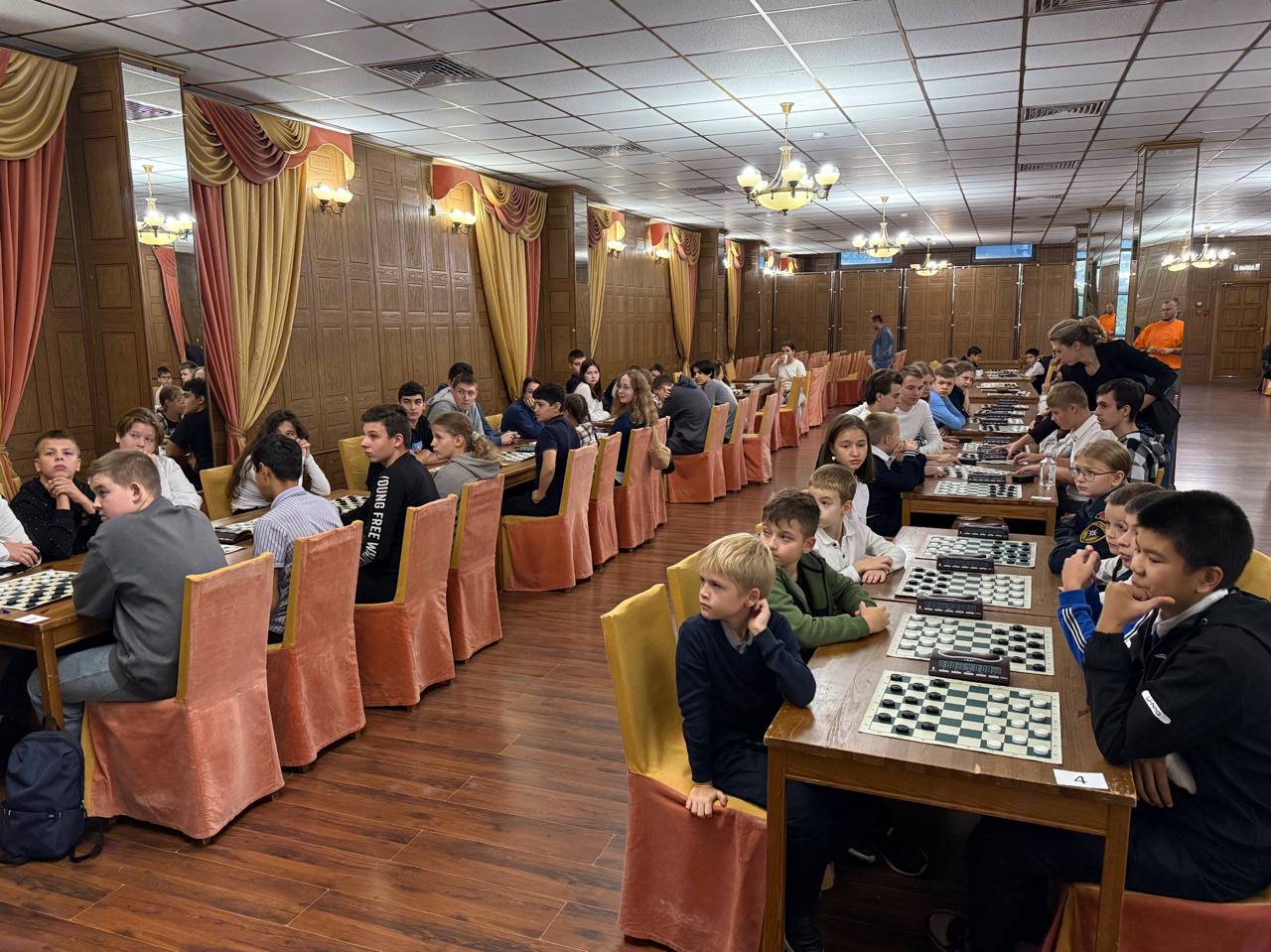 В соревнованиях по шашкам участвовало 12 команд. По итогам семи туров первое место заняла команда гимназии №16, второе — гимназии №18, третье — команда гимназии №5.