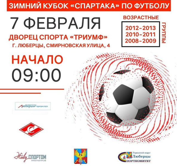 «В это воскресенье, 7 февраля, состоится открытый турнир по мини-футболу на Кубок «Спартака». 14 команд в трех возрастных группах (2008-2012 г.р.) из Люберец и ближайших округов сыграют друг с другом в 25-ти минутных таймах», - говорится в сообщении.