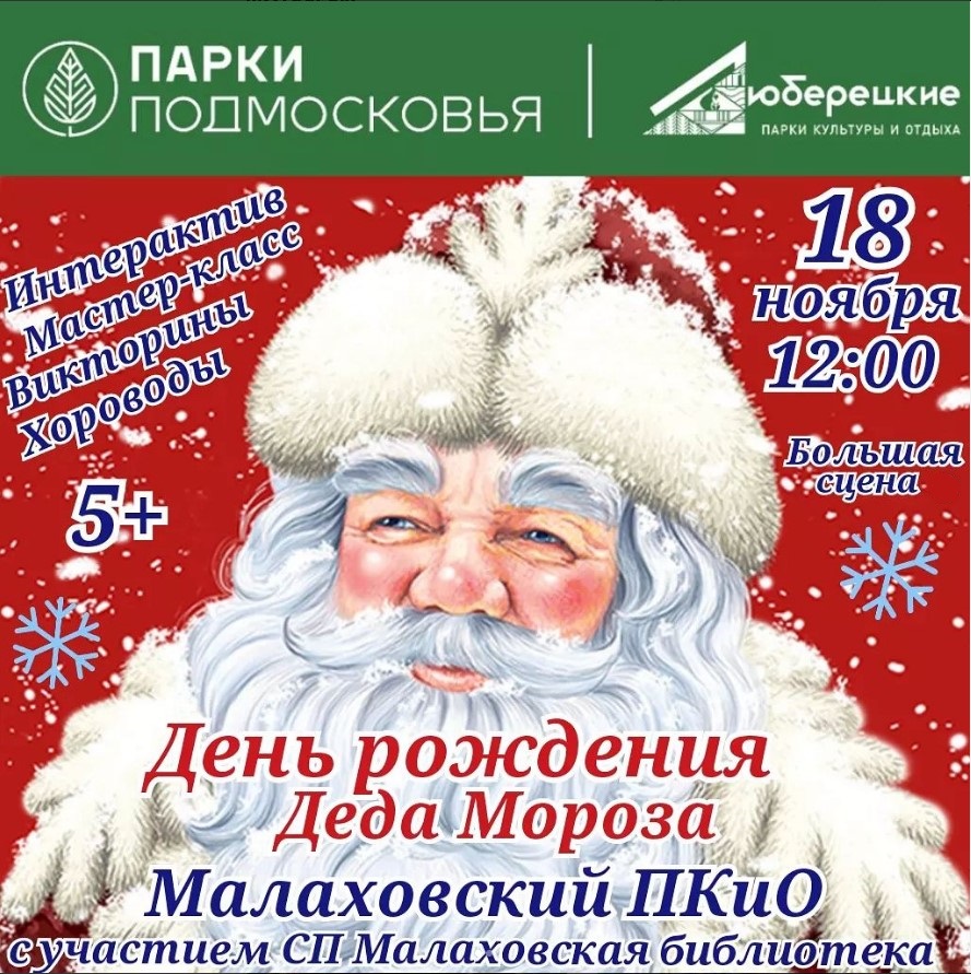 Жителей городского округа Люберцы приглашают в Малаховский ПКиО и Парк «Наташинские пруды» 18 ноября на программу «День рождения Деда Мороза», сообщили в дирекции МУ «Люберецкие парки культуры и отдыха».