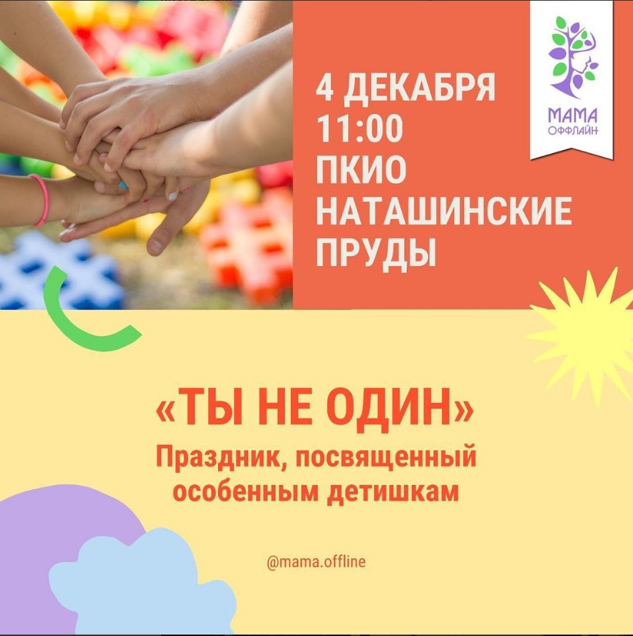 «Третьего декабря во всем мире отмечается Международный день инвалидов. Сообщество Мама Оффлайн не смогли оставить в стороне данный день и для таких деток решили устроить 4 декабря в 11.00 в парке «Наташинские пруды» праздник под названием «Ты не один». На празднике вас будут ждать первоклассные аниматоры, большое количество музыкальных номеров, а также сюрпризы и развлечения», - отмечается в сообщении.
