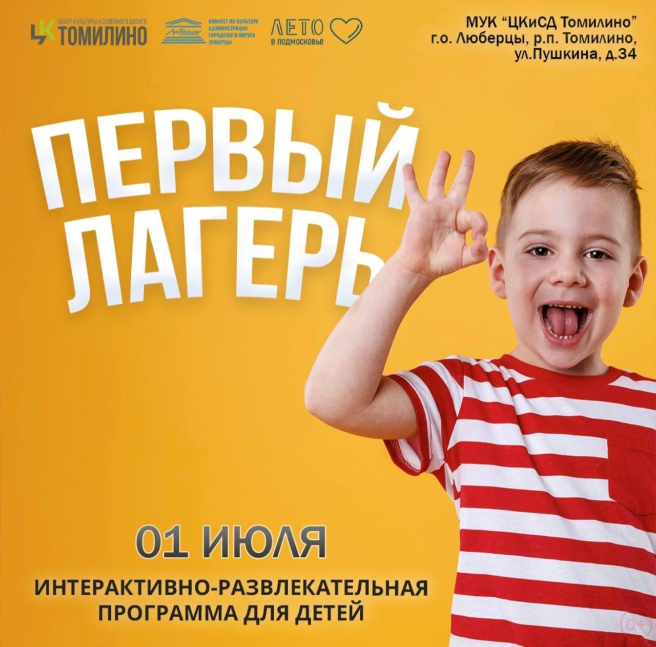 Первого июля в 12.00 в Центре культурного и семейного досуга по адресу: Томилино, улица Пушкина, дом №34 в рамках мероприятия «Первый лагерь» участники лаборатории «Арт-Лето» представят всем желающим свою творческую постановку, вокальные номера, общий лагерный номер, а также шоу мыльных пузырей.