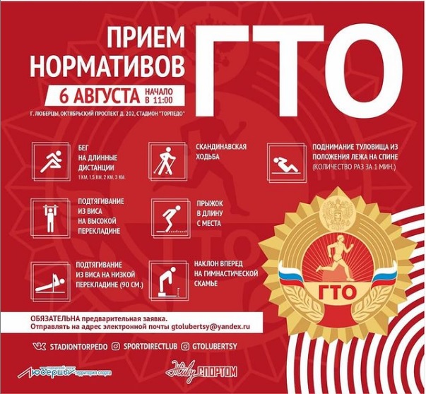 На стадионе «Торпедо» в Люберцах 6 августа жители городского округа могут выполнить нормативы комплекса «Готов к труду и обороне», сообщили в Центре тестирования ГТО муниципалитета.