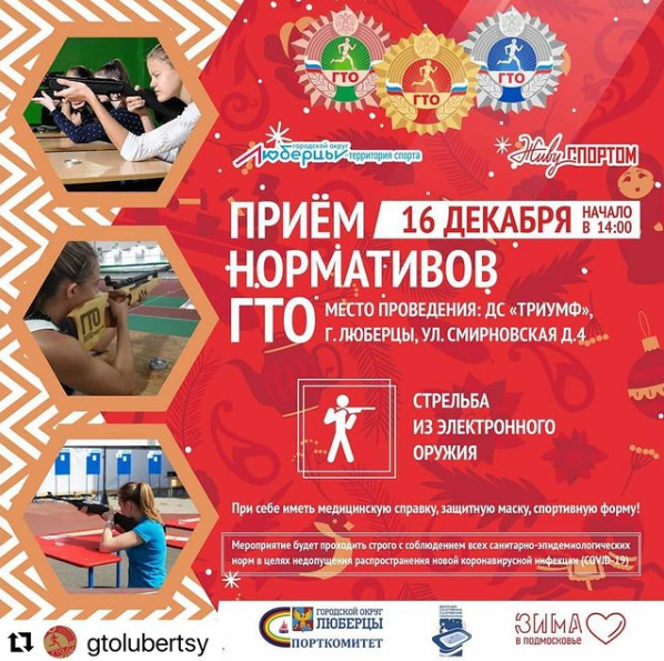 «Всем желающим поучаствовать в выполнении нормативов ГТО по стрельбе из электронного оружия необходимо отправить заявку на регистрацию на адрес электронной почты gtolubertsy@yandex.ru. Спортивное мероприятие состоится 16 декабря в 14.00 в ДС «Триумф» по адресу: г. Люберцы, ул. Смирновская, д. 4», - пояснил Сурков.