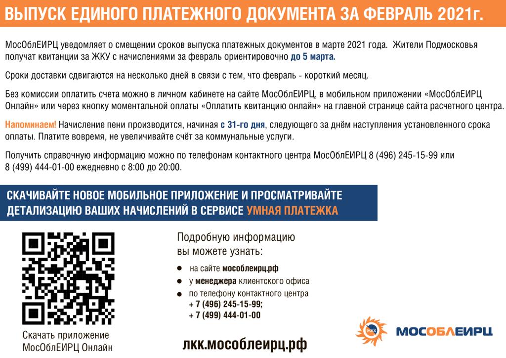«МосОблЕИРЦ уведомляет о смещении выпуска платежных документов в марте 2021 года. Жители получат квитанции за ЖКУ с начислениями за февраль ориентировочно до 5 марта. Сроки доставки сдвигаются на несколько дней в связи с тем, что февраль - короткий месяц», - отмечается в сообщении.