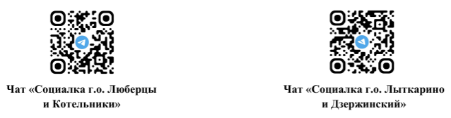 Чтобы не получить отказ в назначении ГСП, перед оформлением Вы можете получить консультацию специалиста социальной защиты в чатах «Социалка г.о. Люберцы и Котельники» и «Социалка г.о. Лыткарино и Дзержинский» (сканируй QR-код) или обратиться лично к специалисту социальной защиты, позвонив на «Горячую линию»: короткий номер 122, далее после сообщения автоинформатора выбрать цифру 6.