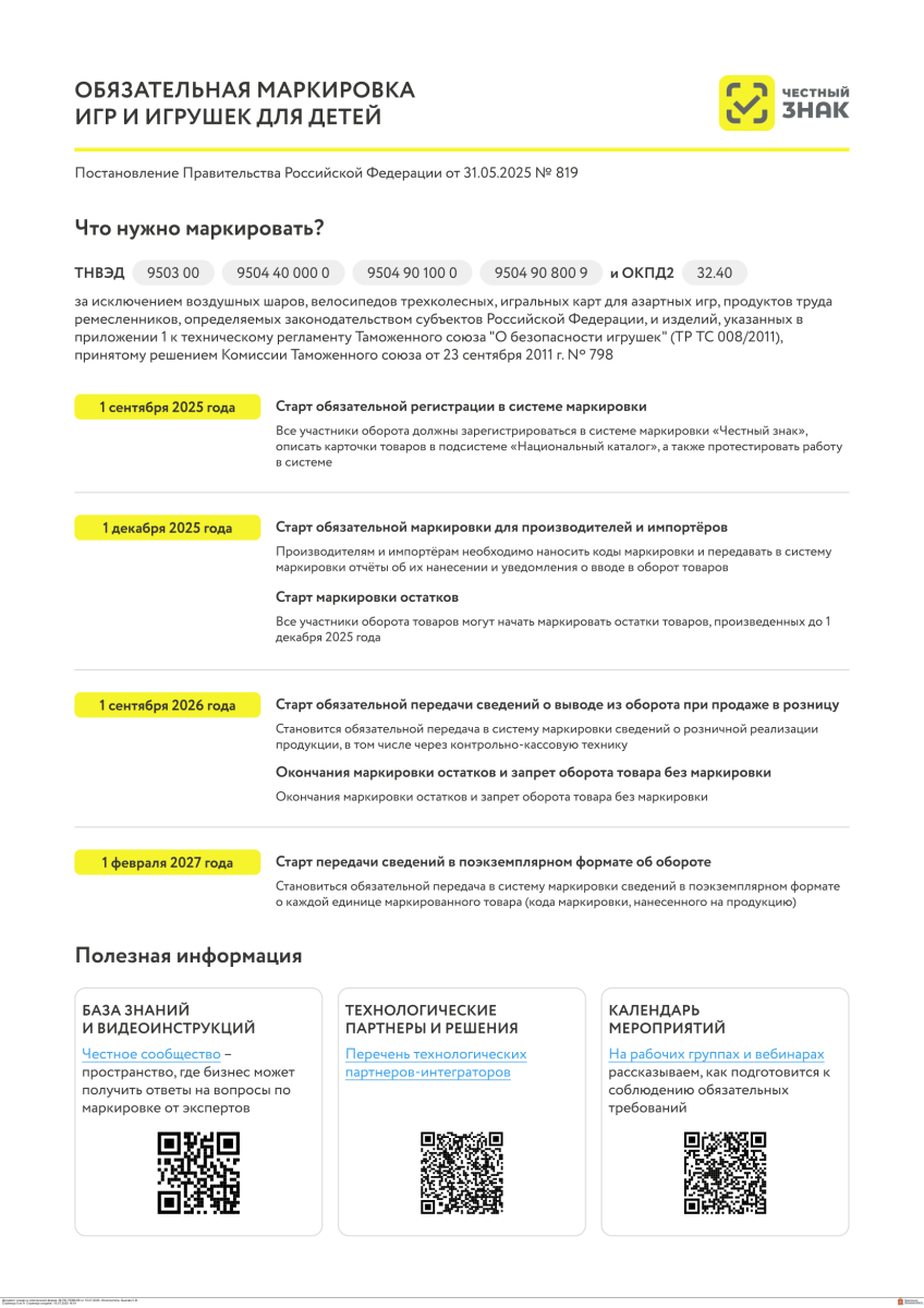 Министерство промышленности и торговли Российской Федерации информирует о том, что с 1 сентября 2025 г. начинается поэтапное введение маркировки средствами идентификации отдельных видов товаров для детей..