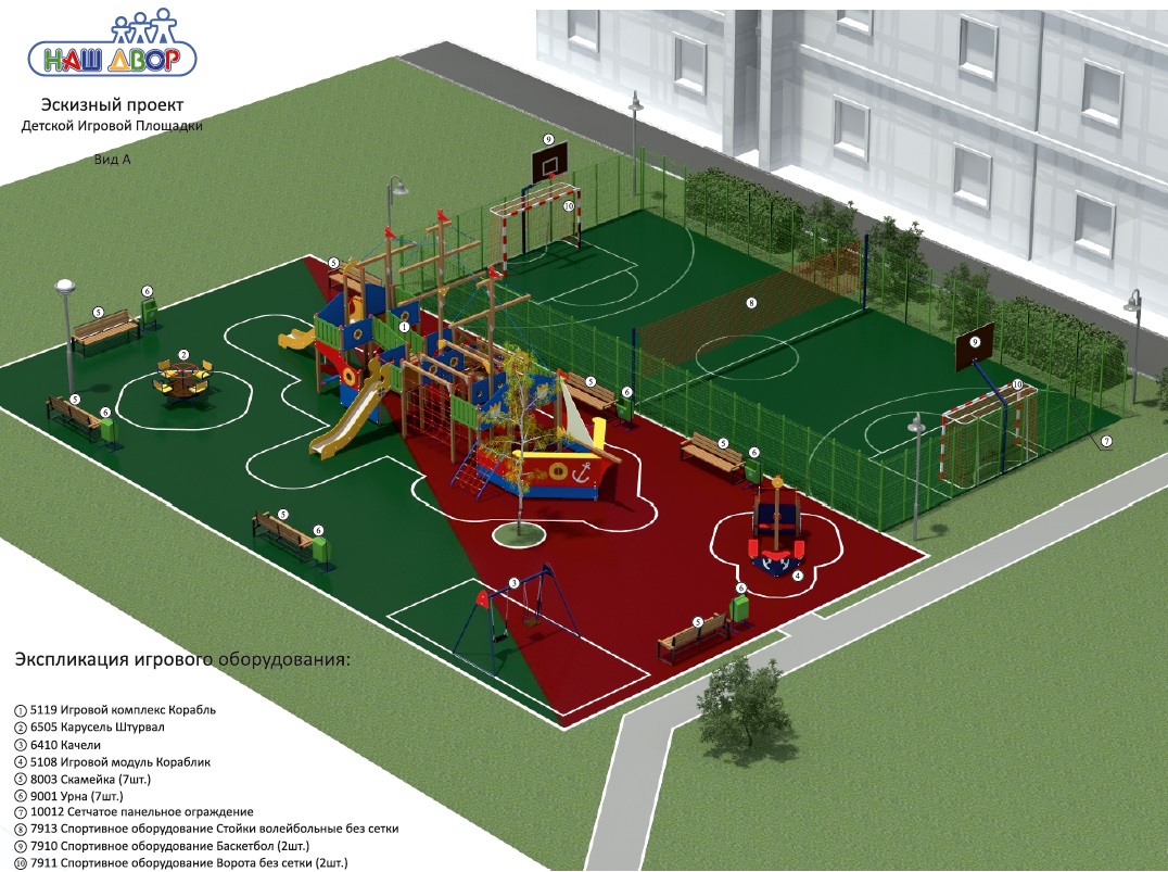 Детская игровая площадка будет установлена согласно программе губернатора «Наше Подмосковье». Она представляет собой многофункциональную спортивную площадку, рассчитанную для игры в футбол, волейбол и баскетбол, и детскую игровую площадку, выполненную в форме корабля. Местные власти берут на себя благоустройство этого двора. Они обустроят парковку, сделают дорожки, обеспечат освещение и видеонаблюдение.