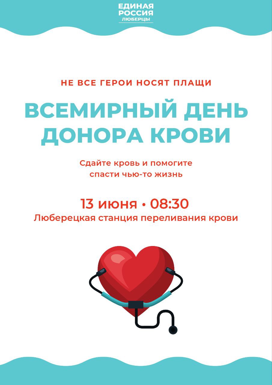 В центре переливания крови городского округа Люберцы 13 июня в 8.30 пройдет окружная акция по сдаче крови, она приурочена к Международному дню донора, сообщил муниципалитета, секретарь местного отделения «Единой России» Владимир Волков.