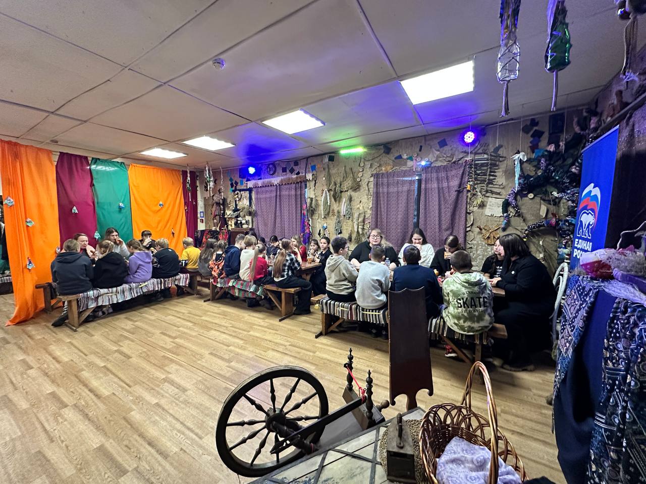 С первых минут программы дети и взрослые погрузились в атмосферу русской сказки. Баба Яга и Марья Искусница делились историями о Лешем, Домовом и других персонажах фольклора, вовлекая ребят в игровые миниатюры и мастер-классы. Юные участники с удовольствием перевоплощались в героев, пробовали себя в новых ролях и преодолевали волнение перед «первой сказочной сценой», а родители наблюдали за этим с теплом и улыбками.